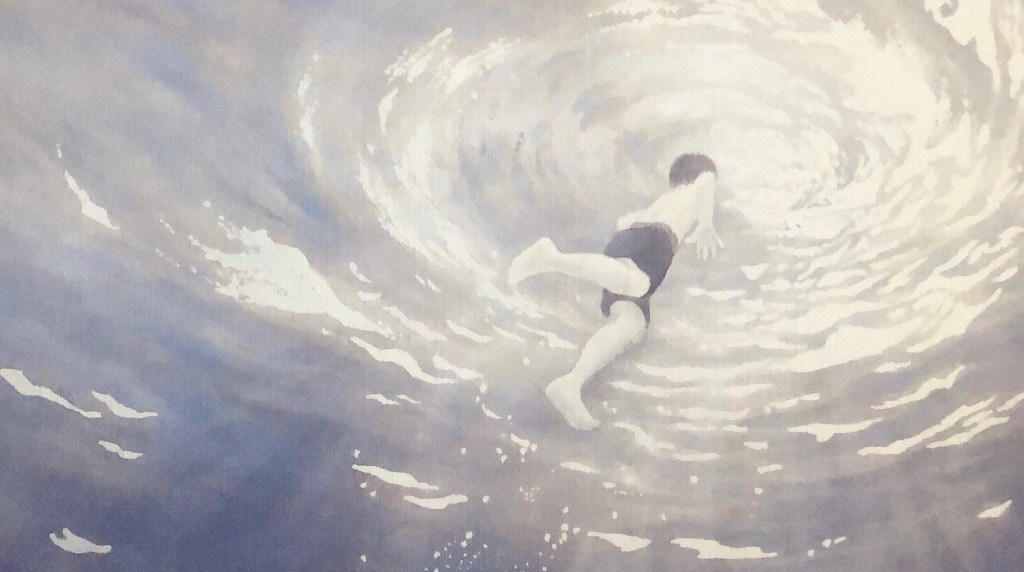 Di questo libro mi ha colpito prima di tutto la copertina: un ragazzino in fondo all’acqua che nuota verso la superficie inondata di luce. Sembra che sia in corso una scoperta e che quel ragazzino si avvii curioso, calmo, verso qualcosa che neanche lui conosce.